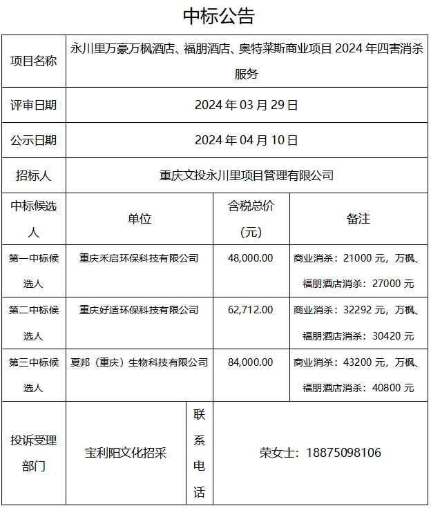 永川里万豪万枫酒店、福朋酒店、奥特莱斯商业项目2024年四害消杀服务中标公告